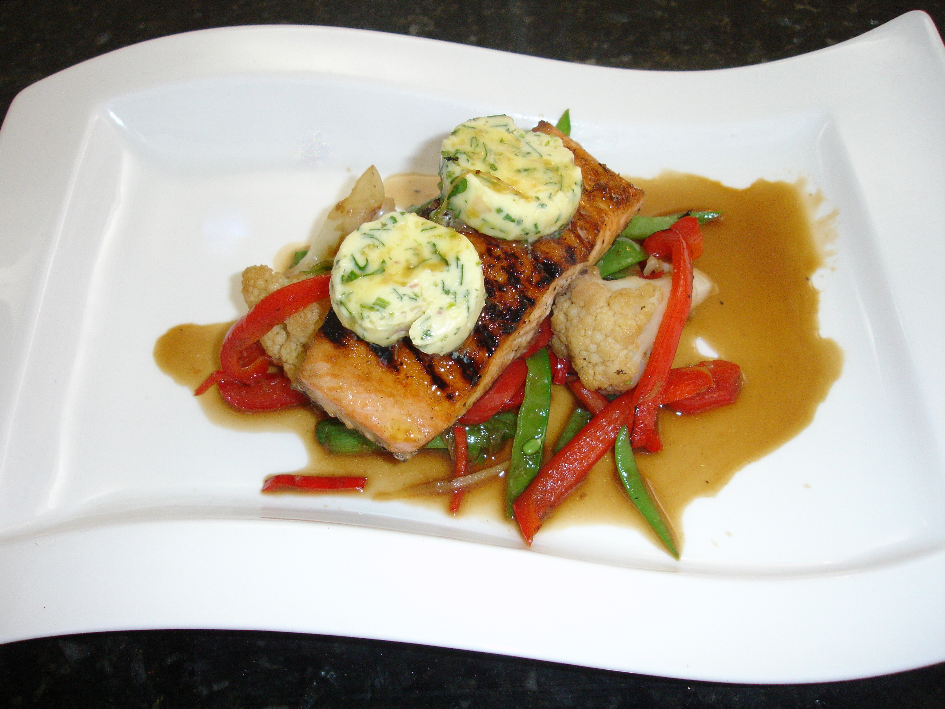 To plate up – serve the fish on top of your stir fry veg and finish with some of the herb butter.