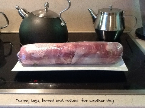 An hours work this morning and the turkey legs are boned stuffed and rolled. Wrapped boudin style in cling and they will be poached and finished it the oven another day over Christmas…. Delish, and that way I won’t be looking at a turkey for days in a row trying to figure out how to eat if before it is past its best.