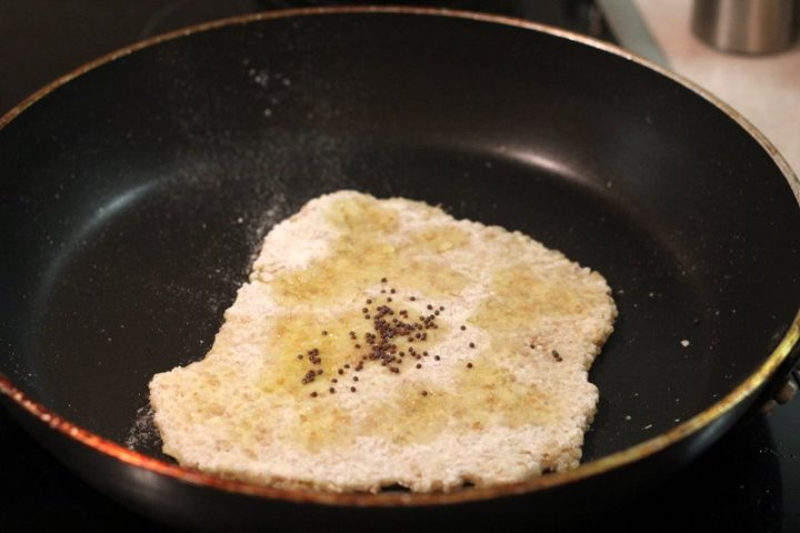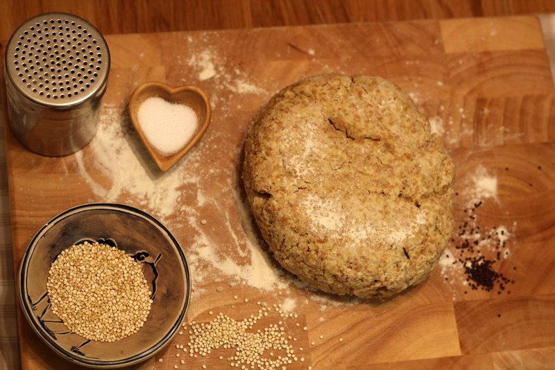 Mix the 2 flours, salt and baking powder in a big mixing bowl. Rub in the oil and add the quinoa and mix evenly followed by 125 mls water. Knead gently to form a dough. Cover and leave for 30 minutes. Divide into balls – each about 70grs and squish the cuimin seeds or nigella seeds into the ball and roll out thinly on a floured surface.