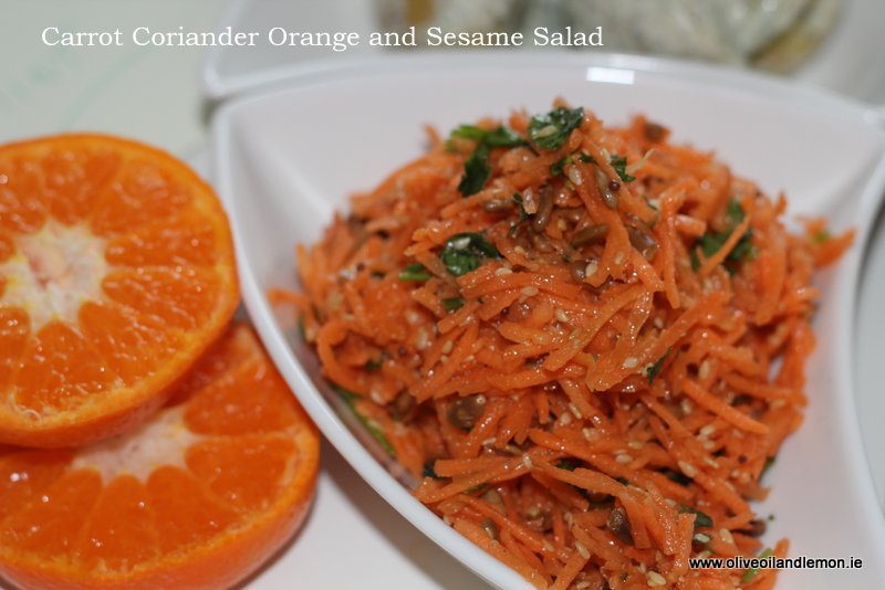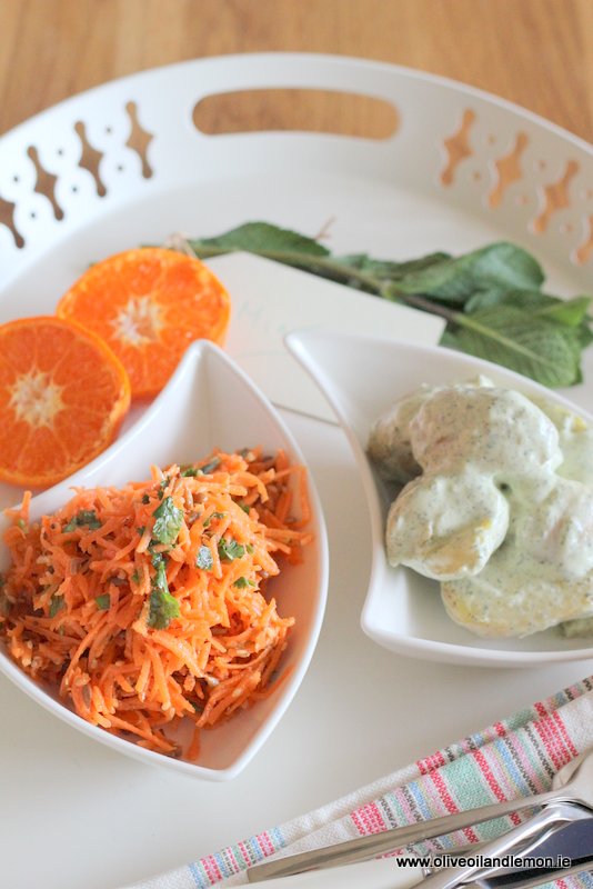 Carrot and Coriander Salad, & New Potato Salad – delicious now that Spring has officially sprung with a stretch in the evening and the hours going forward to give us even more lovely brightness at the end of the day. These 2 salads are a delicious duo, new waxy potatoes dressed with mint and natural yoghurt paired with carrot sesame seed salad with OJ, vinaigrette and some lovely coriander. Nothing like these 2 to make you feel light and airy and think of the summer days and heat to come…. (Hopefully, fingers and toes crossed, we must be due a good summer here in Ireland, we are still talking about the heat wave of ’95!)