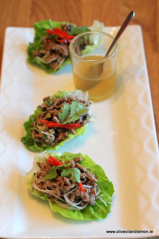 Top lettuce leaves (Gem or cos) with the meat mix, sprinkle some red chilli over and serve with the lime dressing.