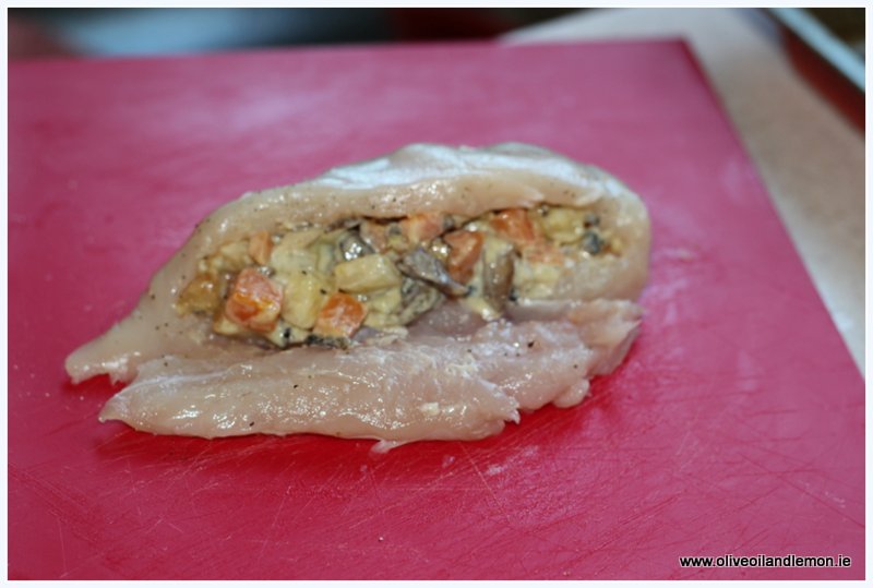 A Duxelle is a usually a finely chopped mixture of mushrooms, onions, shallots and herbs sautéed in butter and or cream and then usually reduced to a paste – used most notably in Beef Wellington or as a garnish. Adapted slightly and not turned into a paste, this makes a delicious side dish working really well with a whole roast chicken. It also works perfectly as a stuffing for chicken breasts which I have done here as well as serving some on the side. This amount makes enough to fill 4 chicken breasts or 2 breasts and some over for a side dish. The flavours of mushroom and celeriac work really well together and I added a glug of madeira to the pan which also is the perfect partner for mushrooms. Topped with cream and really well seasoned, this tastes so good – even someone who thought they did not like celeriac, absolutely loved it.