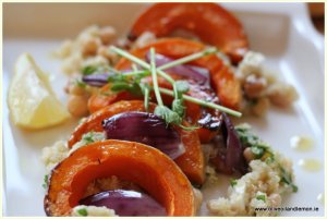 Do you feel fed if you haven’t had meat? I know lots of people, especially men who just don’t feel like they have been fed if they haven’t had meat on their plate. Not me though – I actually did not eat much meat for years, until I started weight training and developed a taste (maybe a need?) for it. There are days still though that I just dont feel like eating meat. I know it’s good for the body to have a meat break and personally I never feel deprived without it, as there are so many delicious ways to combine grains, veggies and leaves. This dish came about by chance after seeing an article on ways to use Quinoa. I’m a big fan of this grain and played around with some of the stuff I had at home and I have to say the flavours of this dish are really exceptional. It’s also great if you are really eating clean, yet filling and full of flavour. The salad dressing uses Pomegranate molasses which is a fantastic addition to your storecupboard and adds a lovely sherberty zing to this. The result was a really tasty meal, deceptively simple for the great flavours it produced. While I used butternut, you can use any squash or small pumkin.