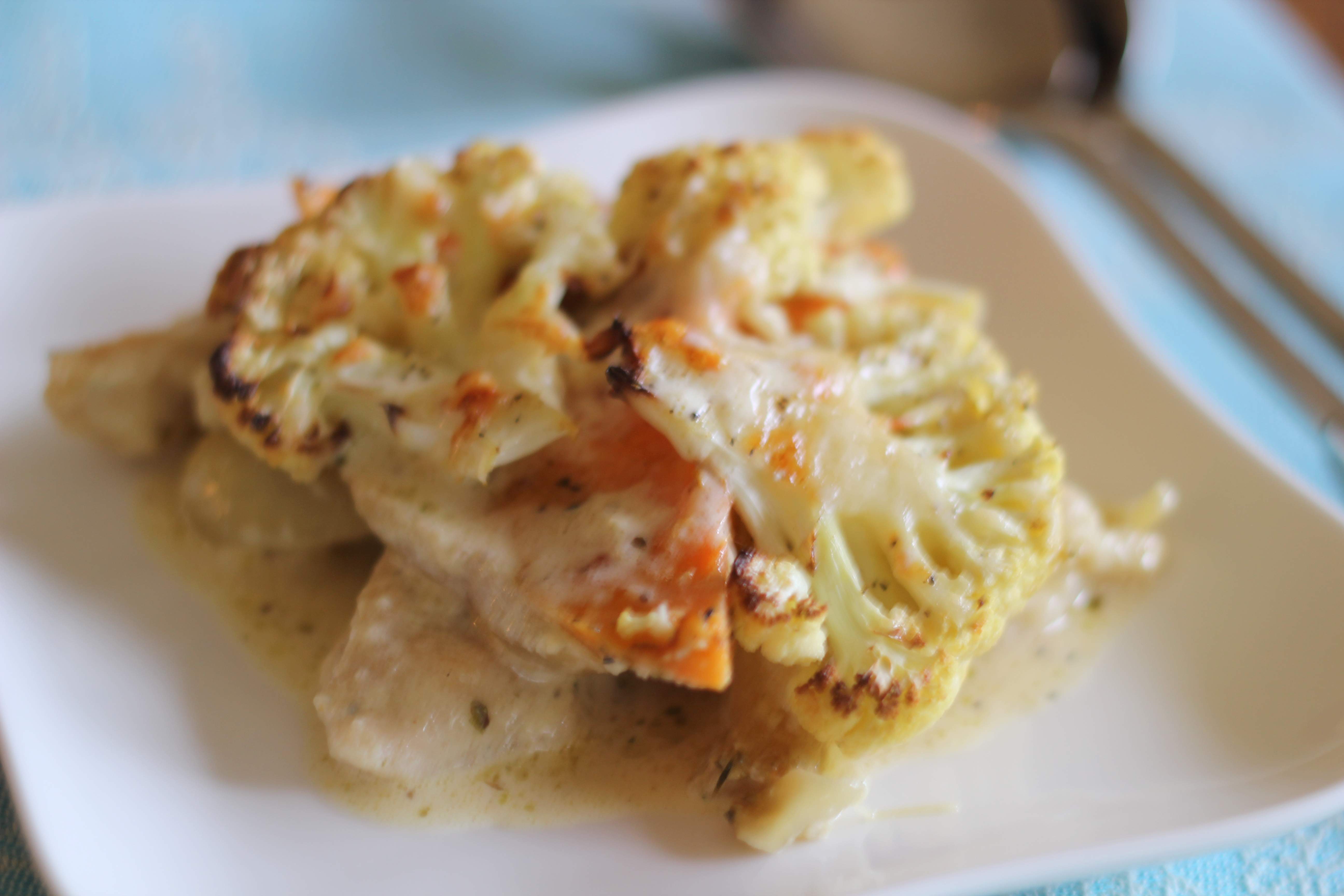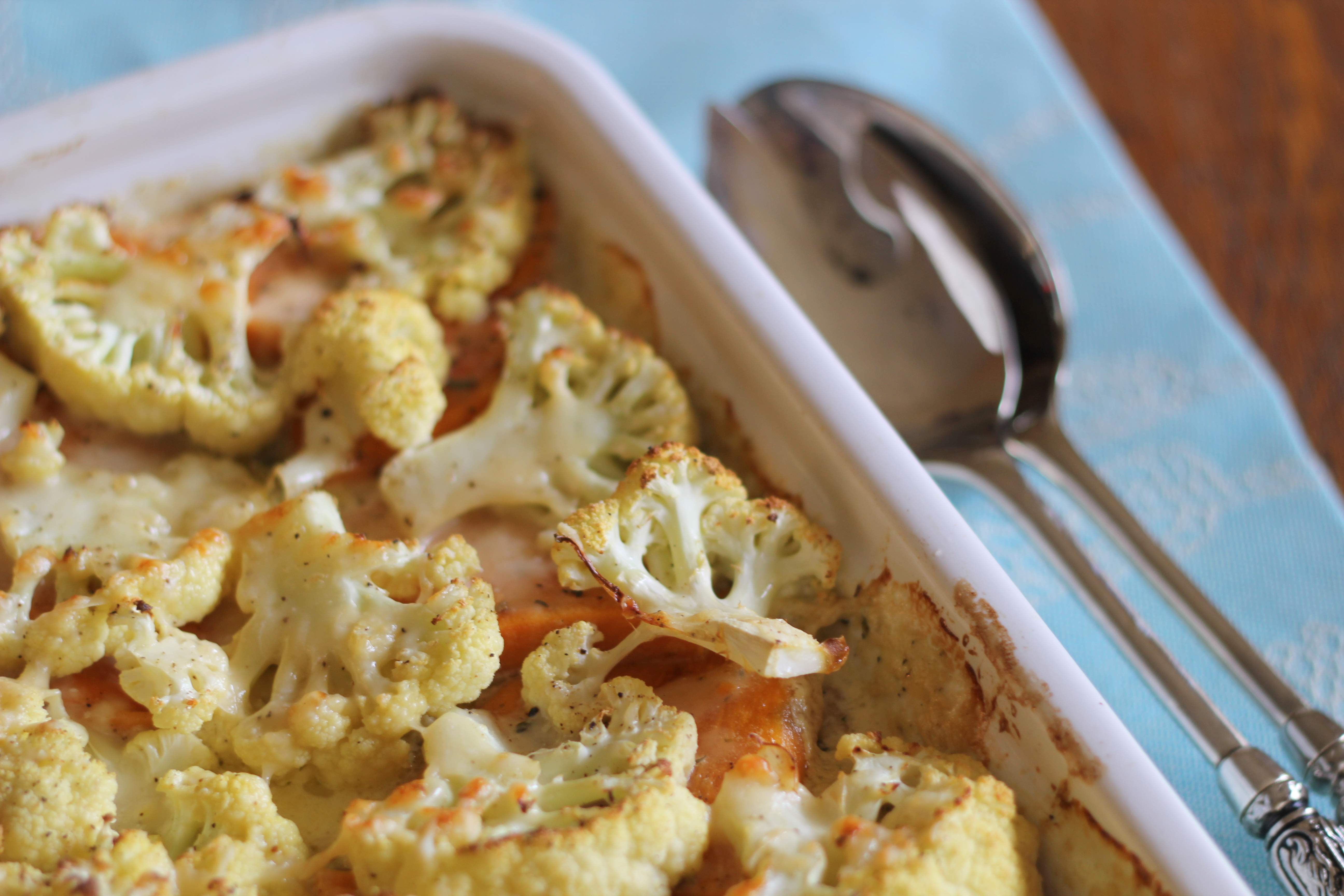 So it’s winter here, the rain is lashing down, there are storm warnings and flood warnings in place. If it was February I would understand, but it’s June….. And by the way we are out of the soccer. If it’s one thing we Irish have in droves, it’s our optimism about our ability to punch above our weight when it comes to soccer. Sadly that dream ended last night. BUT no matter, there are always delicious meals to prepare to chase away the rain. I love cauliflower and especially I have always loved it roasted in the oven – sliced thinly, seasoned and oiled and roasted nutty brown… yum. This concept takes the idea of a good old chicken bake and adds cauliflower for the top instead of breadcrumbs. Try it – I think you will love it, it will definitely chase away the cold – bad sports results are another matter.