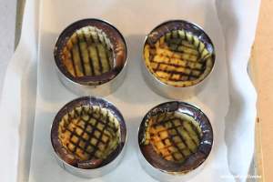 Place rings on parchment paper on a baking tray and place a circle of aubergine into the base of the ring