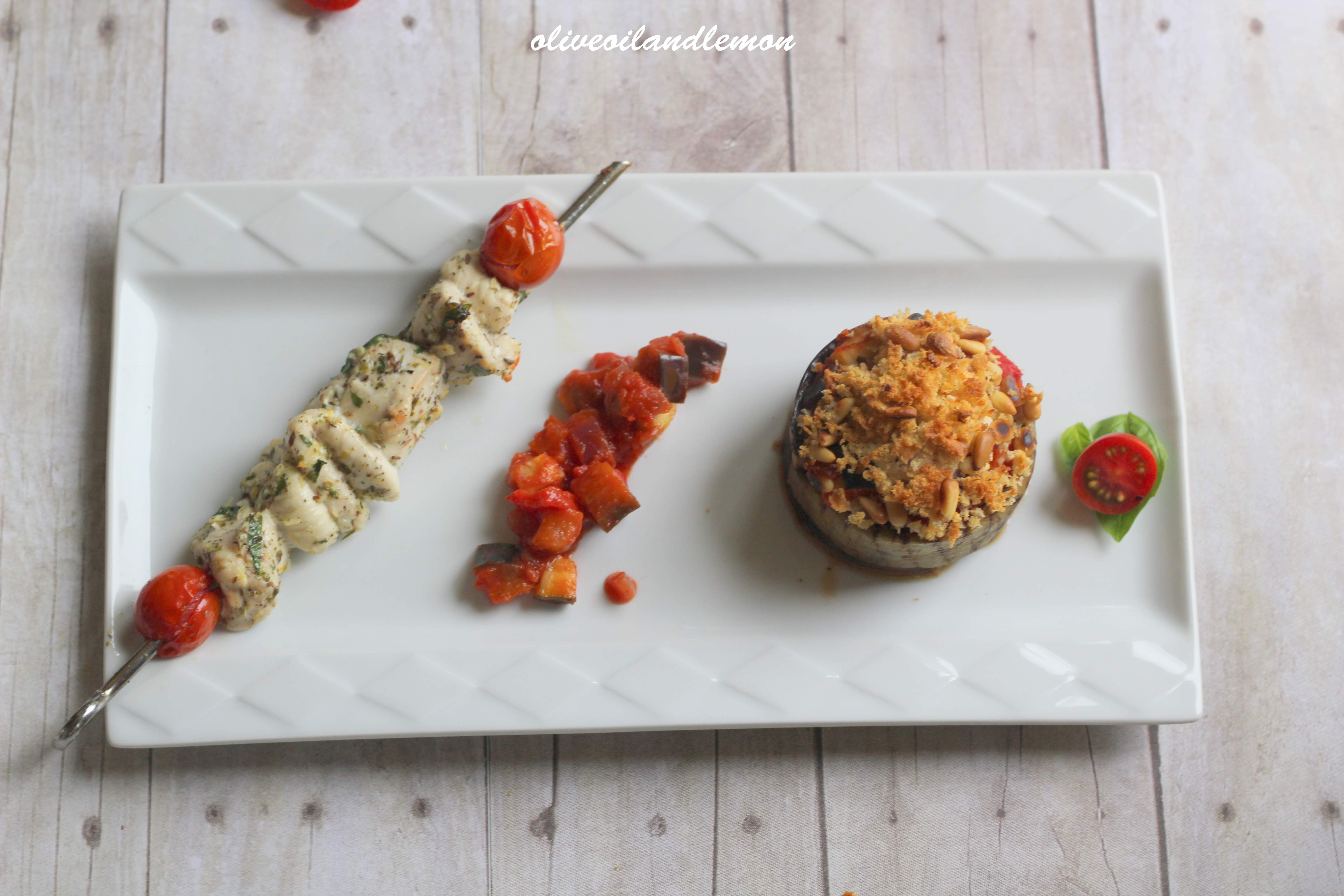 My darling mum made ratatouille most Sundays as an accompaniment to the roast. Sunday dinners were always large affairs, our big family and any friends, boyfriends or girlfriends who happened to be around were always welcome at her table. This recipe came a bit from Dublin Cookery School and a bit from memories of my mum although she always made it in a casserole dish I have stacked it using a stainless steel ring – it makes a more dramatic plate but is still really easy. An optional topping of goats cheese and crumbs make it more substantial – serve with a green salad for lunch only or with the chicken brochette for a great dinner. Full of the taste of the med and the goodness of these great vegetables. Full of memories for me..