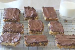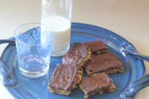 When cool, melt 150gr of good quality chocolate and pour over the flapjacks and when set cut into bars-I usually get about 12-15 from this tin……Yummy