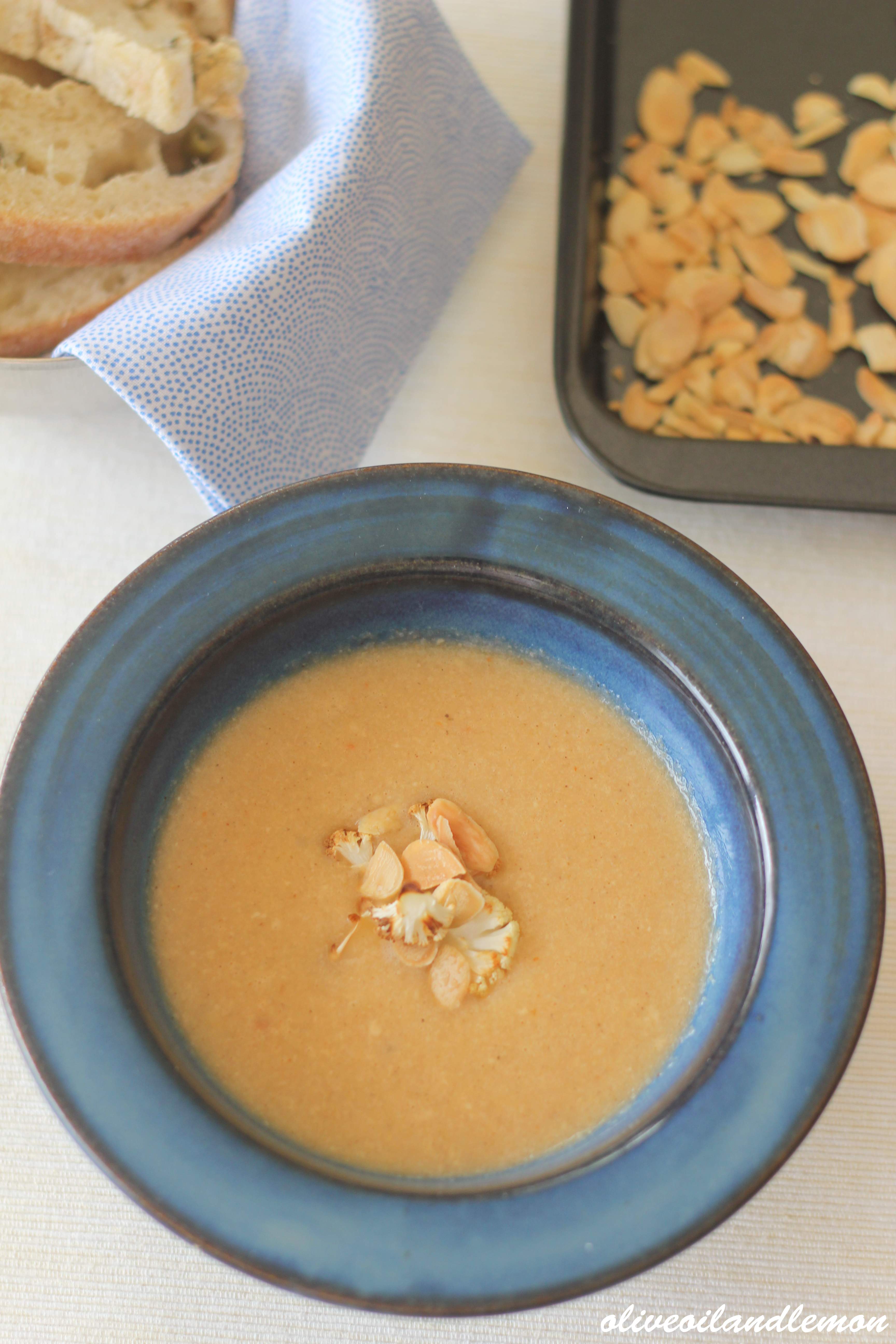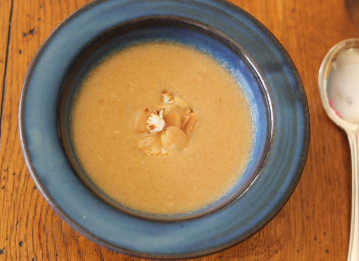 Blend until smooth and serve with a topping of the roasted cauliflower florets, some extra almonds and a drizzle of harissa paste if you want even more heat.