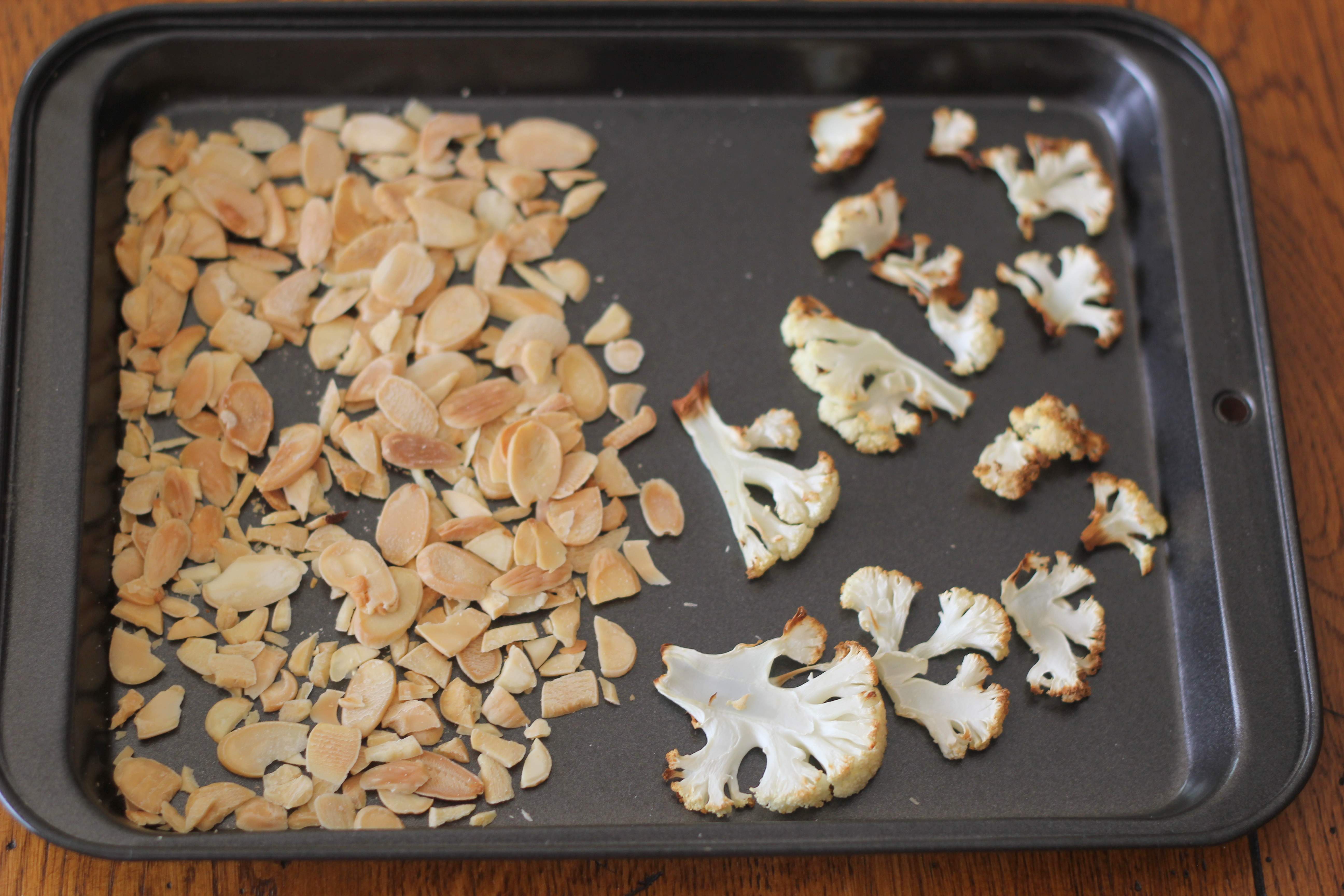 Add the stock and flaked almonds, bring to the boil and turn down to a gentle simmer until the cauliflower is just cooked – about 15 minutes.