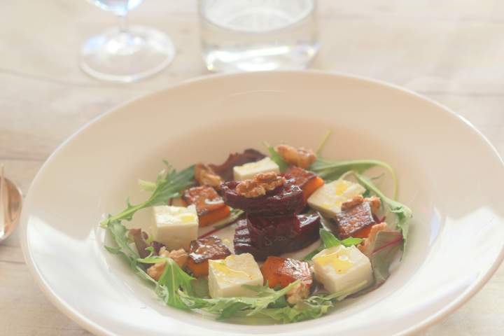 Arrange the beet, squash and feta on a plate and add the mixed salad leaves.