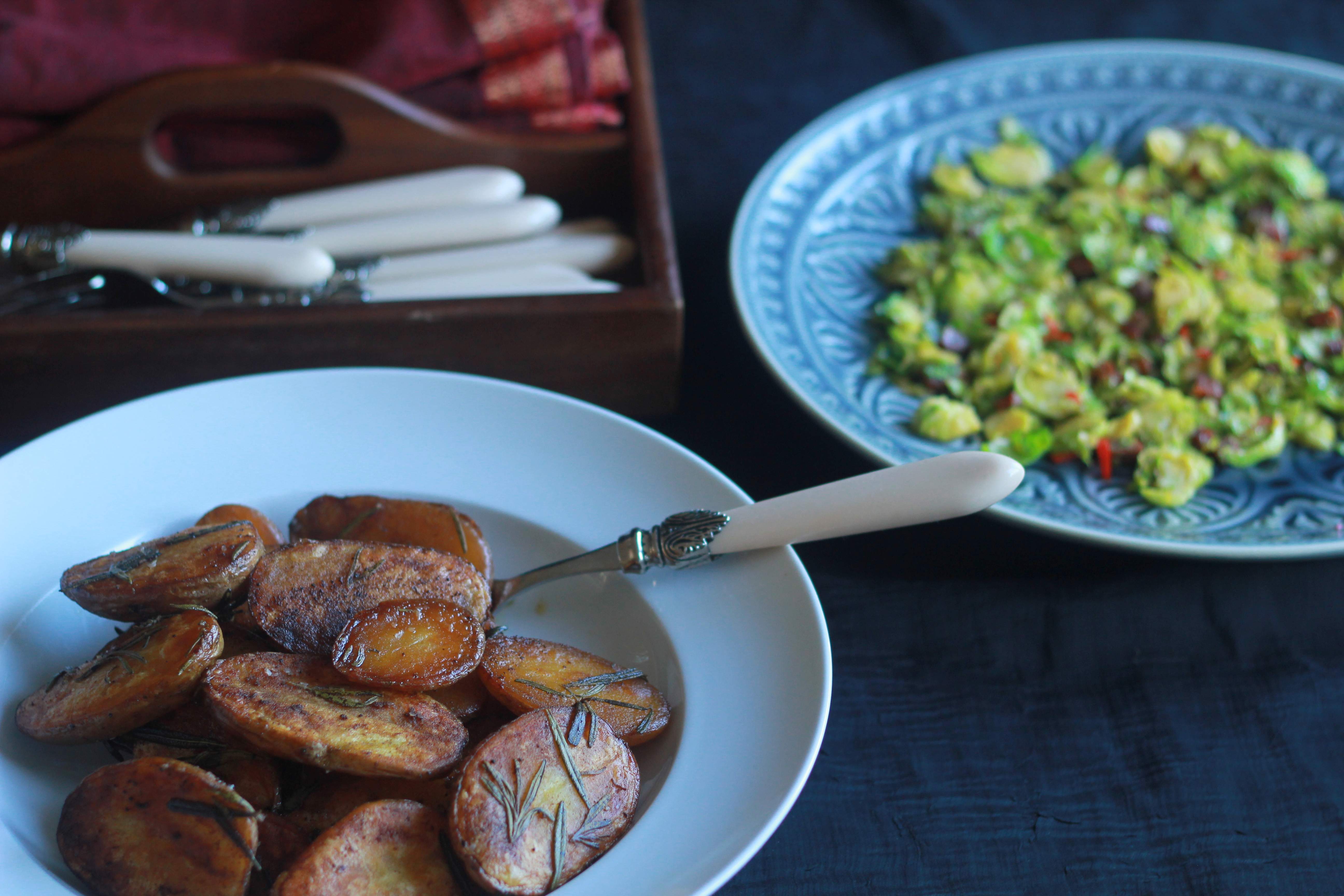 Griddled Lemon Chicken, Pan Fried Brussel Sprouts with Chorizo and Crunchy Rosemary Potatoes