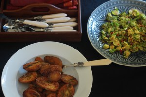 Griddled Lemon Chicken, Pan Fried Brussel Sprouts with Chorizo and Crunchy Rosemary Potatoes