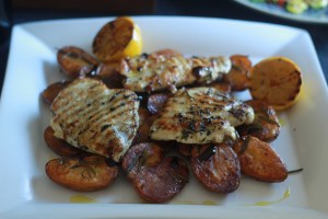 Griddled Lemon Chicken, Pan Fried Brussel Sprouts with Chorizo and Crunchy Rosemary Potatoes