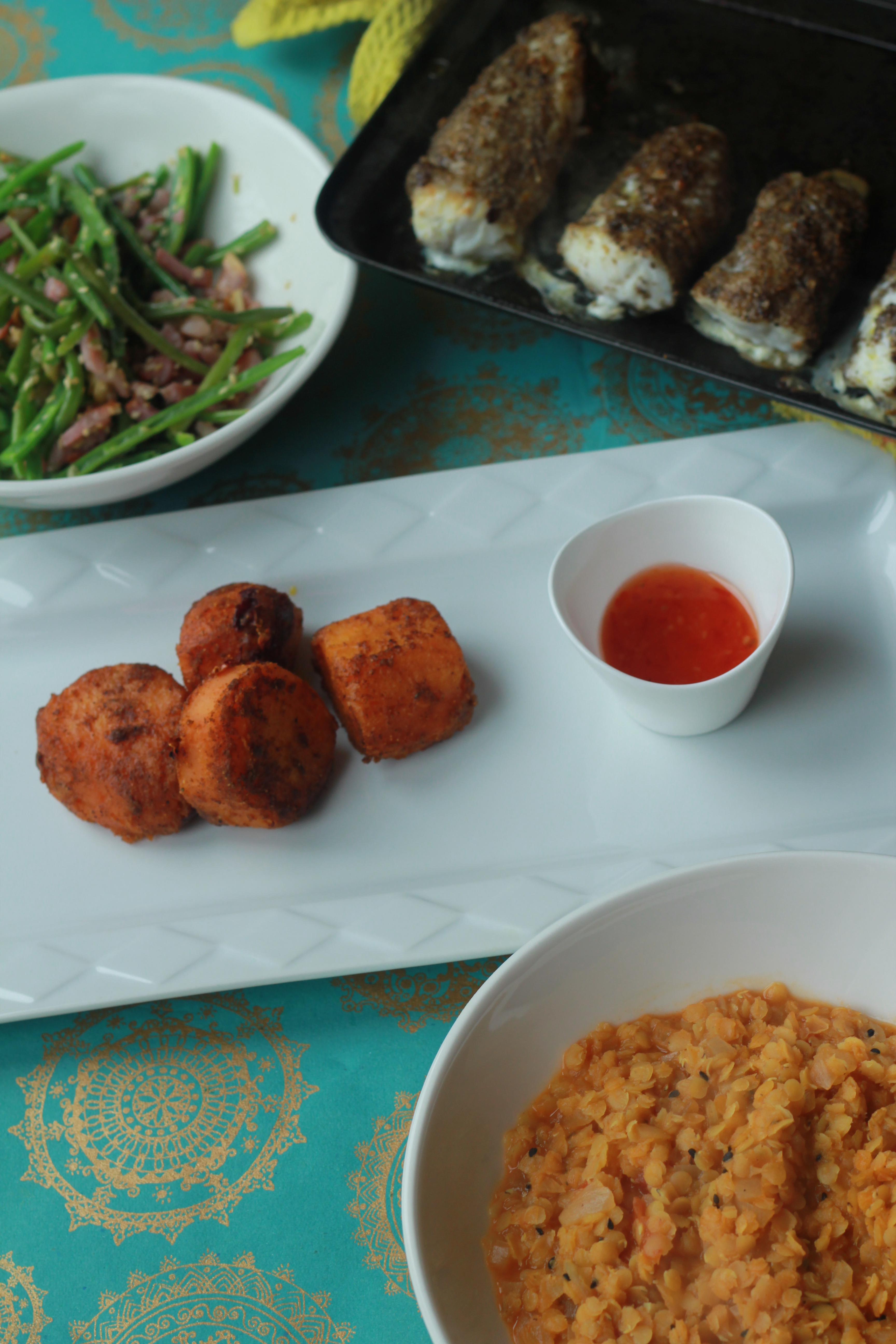 Sometimes there is just no point in looking for attention (or conversation!) Last weekend was one of those – Golf and Rugby, forget about any decent chat apart from the odd grunt so I just got cooking. The sweet potatoes crisped with the spices are a really nice alternative to the usual steamed version and the green bean and lardons are delicious just warm as a salad. The Monkfish needs minding but it cooks so quick that its not like slaving over a hot stove for hours, it’s cooked in under 10 minutes. Don’t feel like you have to produce all these for one meal, I had time on my hands. Any one of these are delicious accompaniment with the fish and the result is an amazingly tasty nutritious meal. Oh and I did get a thank you after it!.