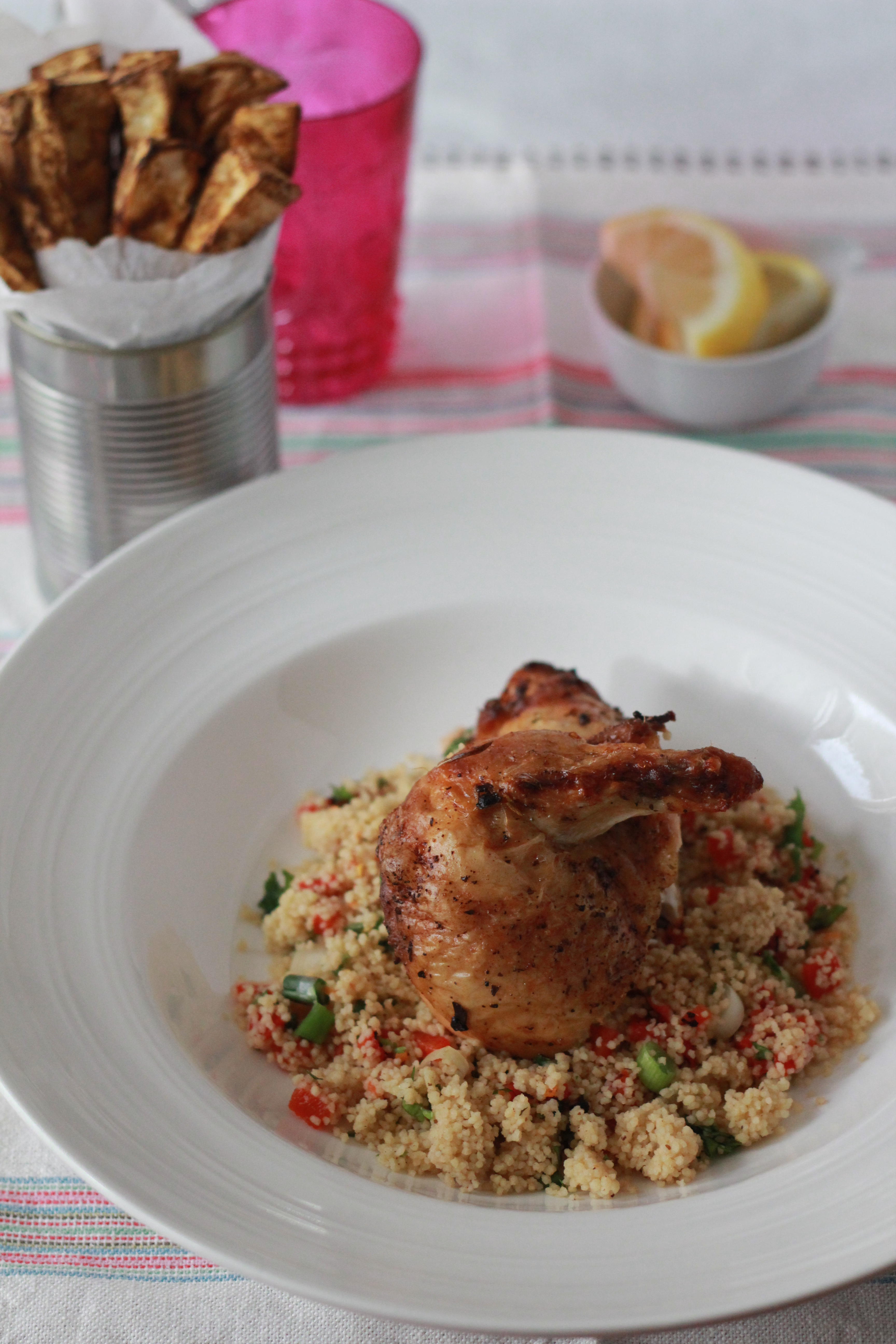 Add a little middle eastern magic with a couscous laced with Sumac complimented by chicken baked with a garlic and lemon marinade, accompanied by celeriac chips- perfect for an easy weekend supper. Marinade the chicken in the morning to save time and add flavour. If you only have boneless chicken then make up skewers and throw them on the barbie or griddle pan instead. Perfect summer eating full of flavour and goodness. Try what I did and say nothing about the celeriac, I just called them chips and they went down a treat.