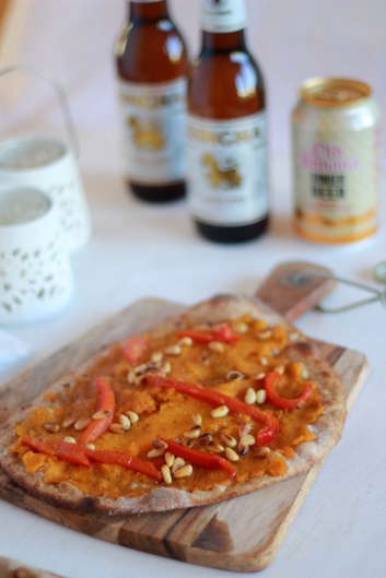 Top the flatbread with a layer of the squash mix. a layer of chopped peppers, some toasted pinenuts, season well, drizzle over some oil and tip into the oven to bake.