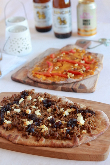 When cool, top your flatbread with a layer of mince, some balsamic onions, cubed feta, and drizzle over extra olive oil and into the oven to bake.