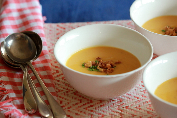Butternut squash soup with Cumin, Chives and Crispy Onions