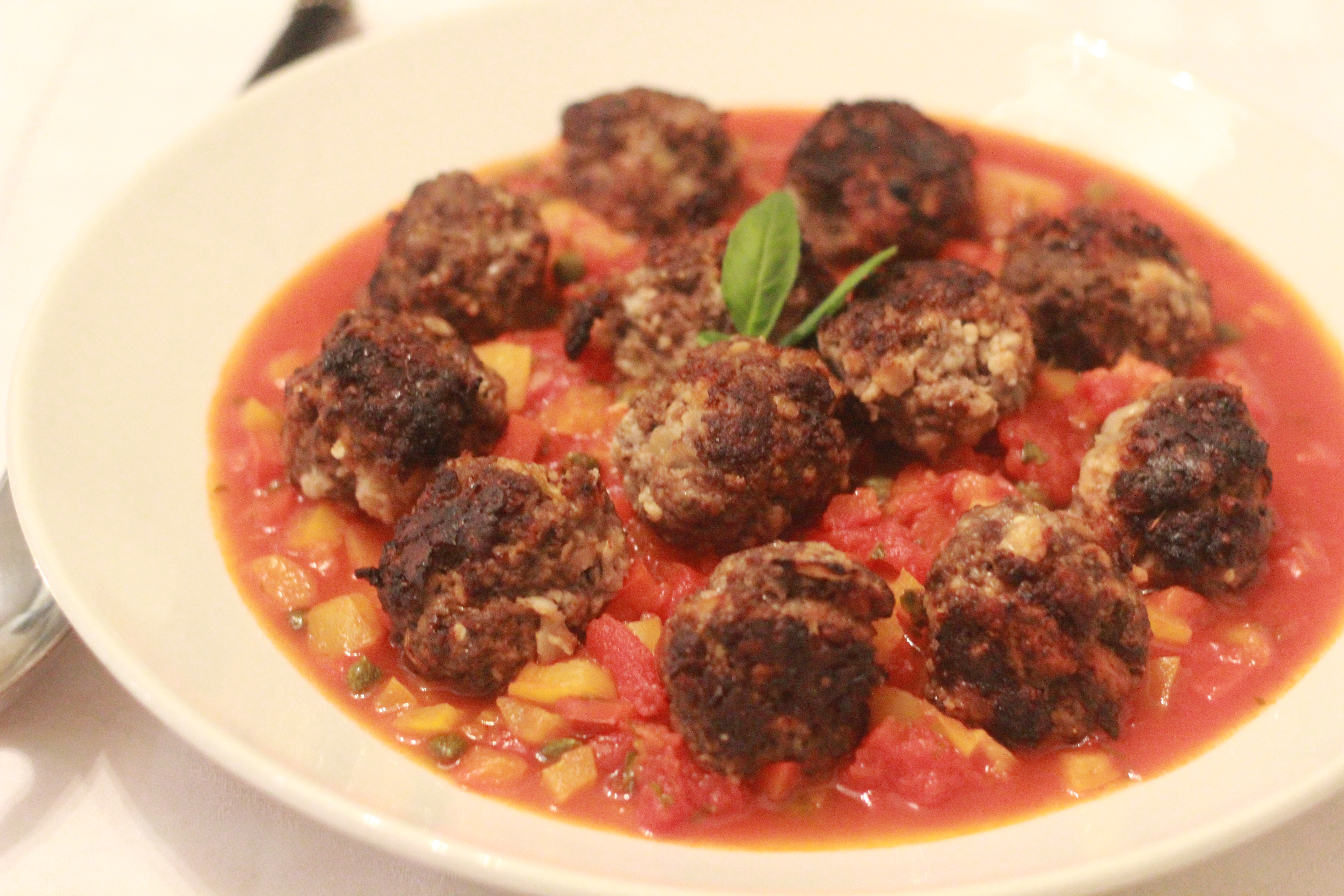 Simmer for a few minutes, take out the Rosemary, add the capers, olives. Simmer for a few minutes, season including sugar if required. Add the meatballs and cook on low until they are cooked, about 15 minutes.