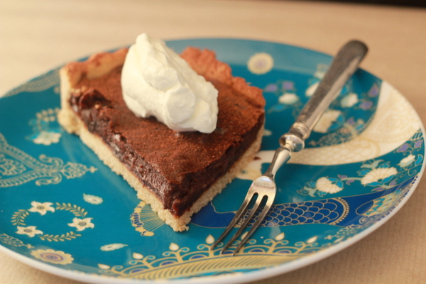 I make lots of chocolate cakes & tarts and while there is no way to make them completely healthy and caloriefree (is that a word?) I try make sure I have done a workout first and also used really good quality ingredients. If you keep the cocoa solids content high then the resulting chewy chocolaty tart will be worth it. Made with a mix of gluten free flour and almond or hazelnut flour gives a delicious pastry. This tart will feed quite a lot and a small piece is enough with a dollop of cream on the side..unless you are my other half and a small piece is not enough at all 🙂