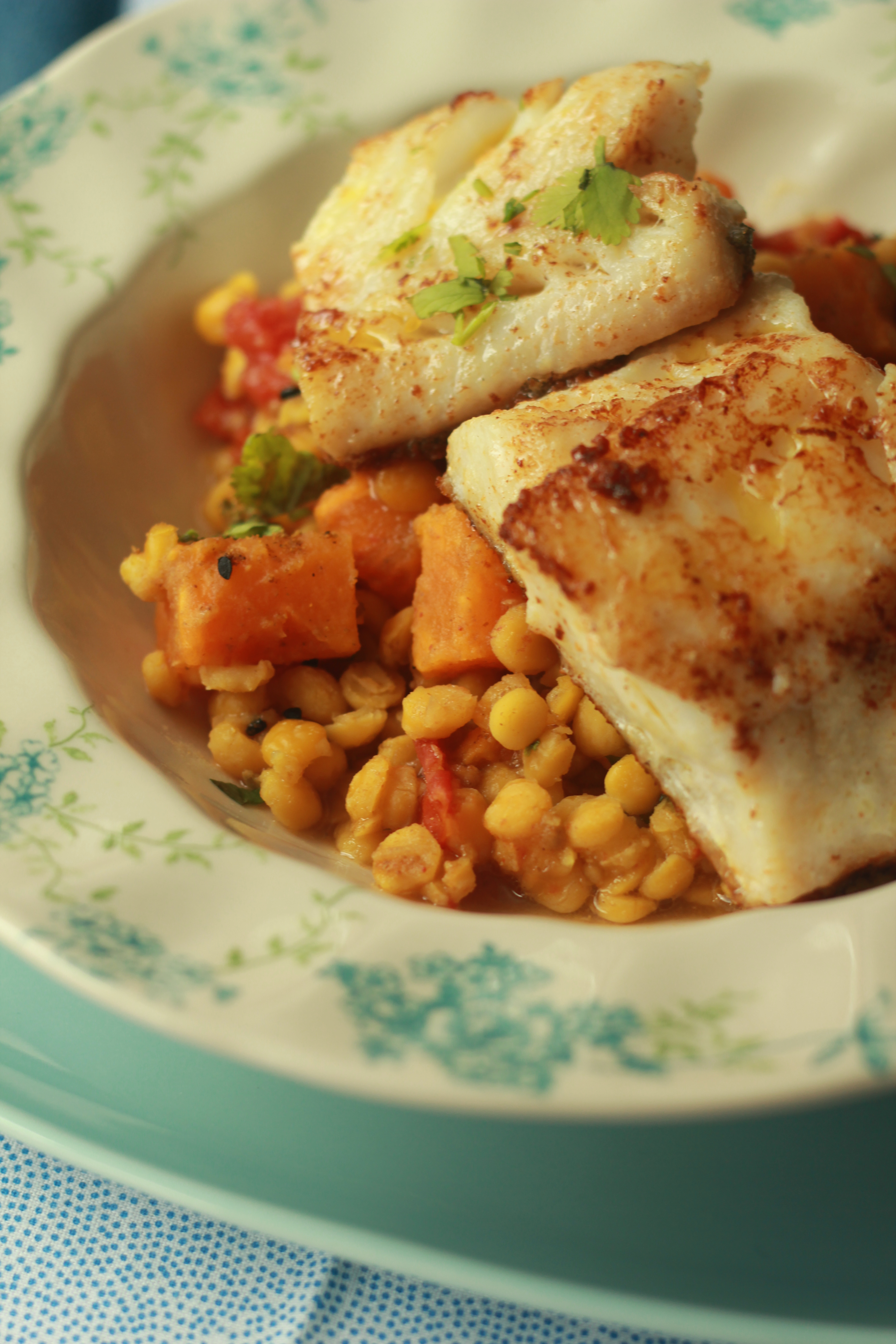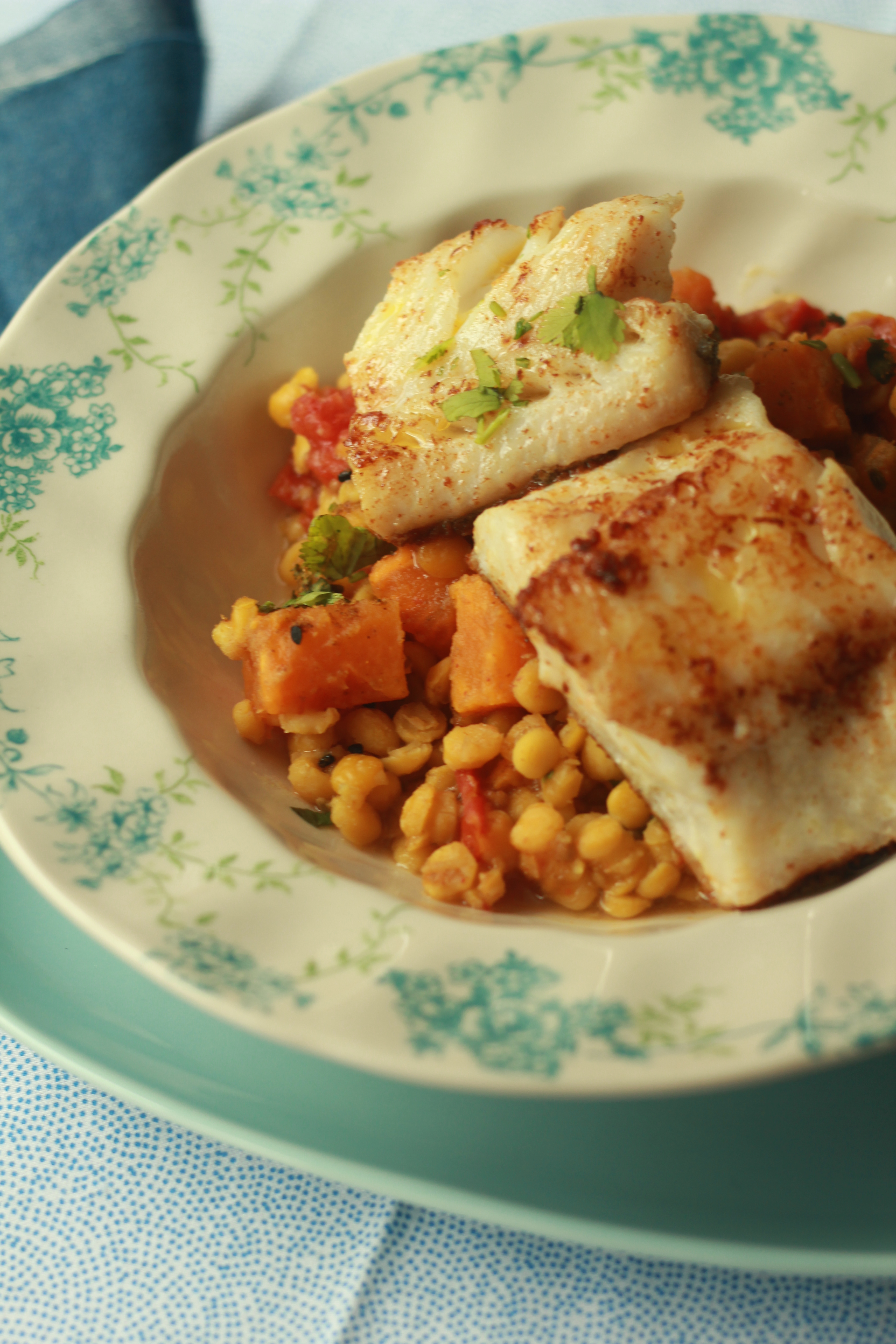 This lentil dish is delicious on its own or paired as I have done with some fish. Any firm white fish works really well with this dish and the gentle spicing gives delicious flavour, a nice subtle amount of heat as well as a great dose of antioxidants – just make sure you spices aren’t in the press for years… 🙂