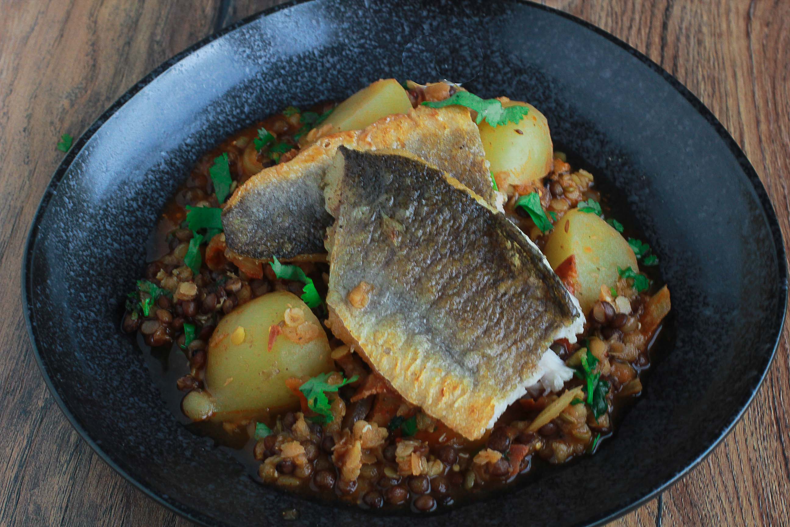 Spiced Lentils, Potatoes and Fish
